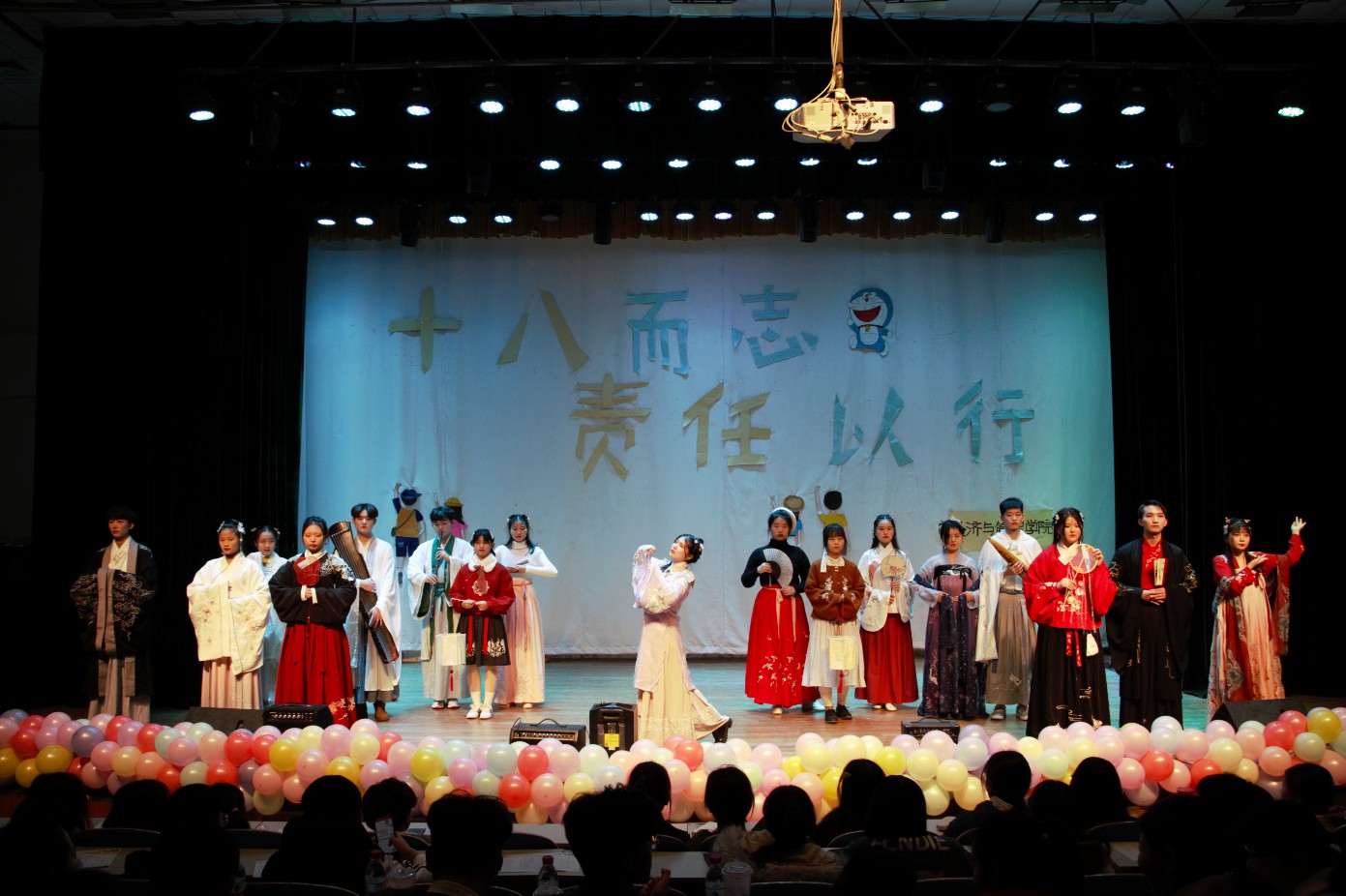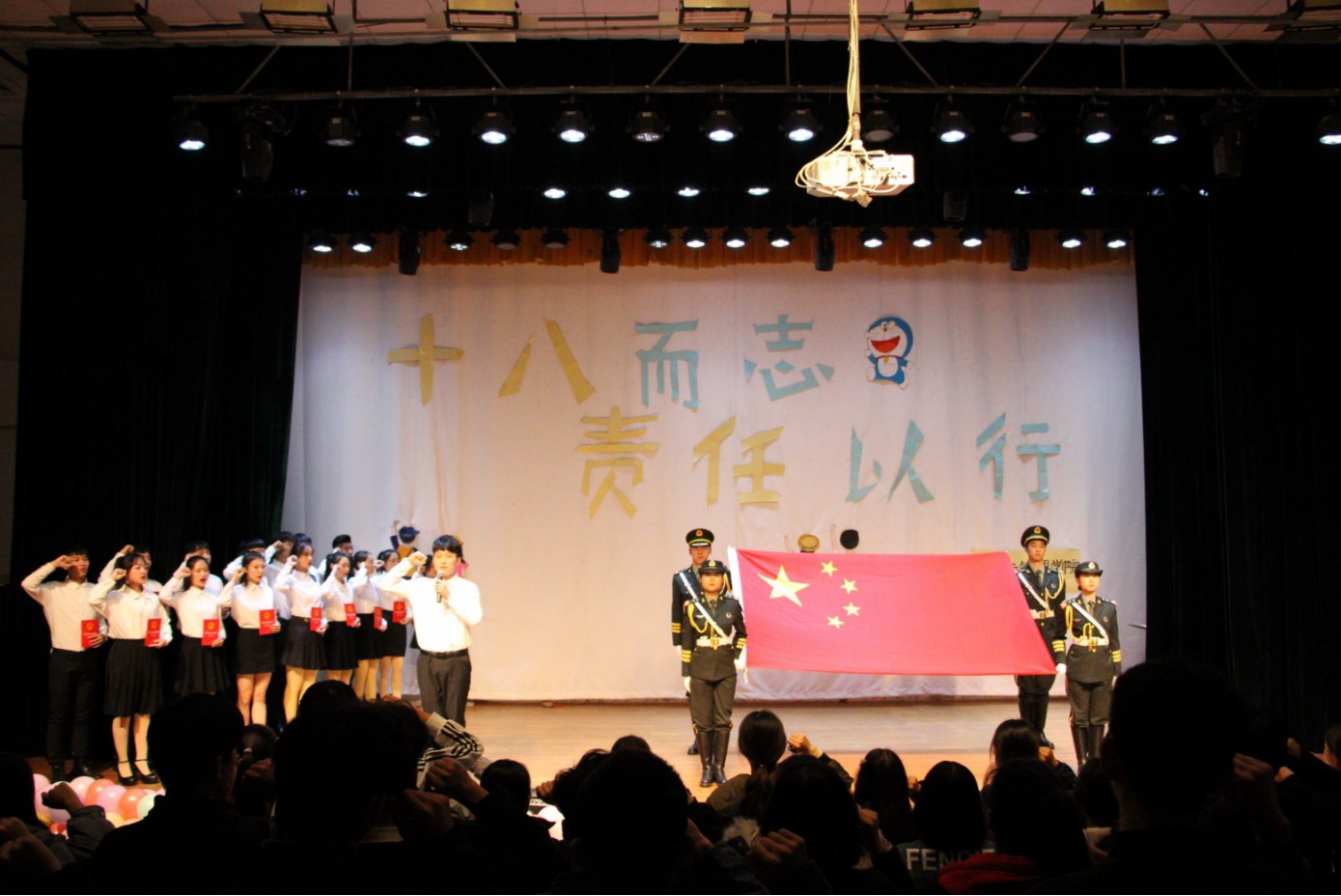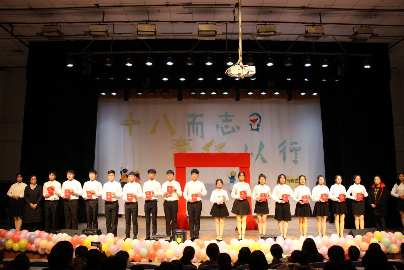下午2点,典礼在开场wota艺人《梦回还》中拉开帷幕,汉服走秀《少年游》让大家领略了中国传统服饰的魅力,正所谓“有礼仪之大,故称夏;有章服之美,谓之华。”而《琴书赋艺》又让同学们见识了中国源远流长的传统文化。舞台剧《成人礼》为大家演示了古代成人礼的流程,让同学们清楚的了解了古代的“成人典礼”。随后,16名同学作为代表以饱满的热情通过成人门,并由姚少华老师与高冰倩老师为他们颁发《中华人民共和国宪法》,作为迈入成人“门槛”的礼物。通过这份礼物是要告诉成年学生,这意味着每一位成人的同学要时刻将祖国、法律、责任放在心头,将和所有成年人一样担负起对家庭、对民族、对国家的应有责任。400余名学子热情高涨,紧握右拳,面对国旗庄严宣誓,在鲜艳的五星红旗下许下了自己真实坚定的诺言。歌曲《少年心气》带给了同学们一场听觉上的盛宴,从歌曲中听到了青春的活力。第九届成人典礼取得圆满成功。