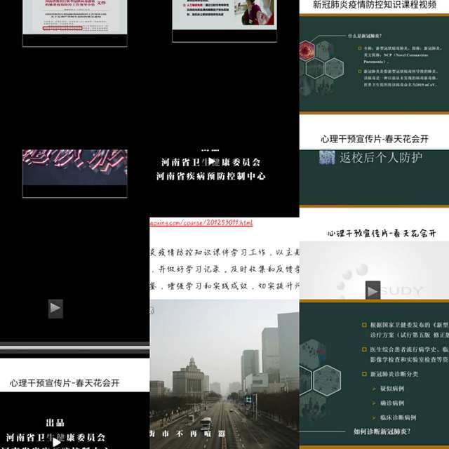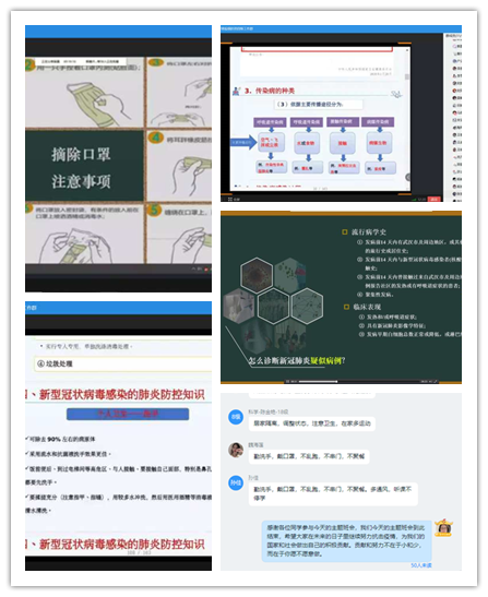 本次疫情防控知识由各辅导员、班主任根据班级实际情况组织各班学生认真集体线上学习或者线下分散学习,并要求同学们要学有所获、学有所得。翟德胜教授的《新冠肺炎疫情防控知识课程》从新型冠状病毒肺炎、居家个人防护、返校途中个人防护和返校后个人防护及疫情防控四个方面讲解,让同学们对疫情防护防控知识有了更进一步的了解,并对大家的日常生活和未来的开学生活有了科学性指导。《春天花会开》展示了平日的郑州被这场突然其来的疫情强制按下暂停键,而这场没有硝烟的战争中,每一个平凡的你我都成为重要的一员,大家在党的坚强领导下坚信,只要我们在一起,春天花会开,明天会更美好!同学们结合疫情防控知识开展了形式多样的特色线上“新冠防控,轻青在行动”系列主题班会,并对新冠防控知识进行交流,班会中同学们采用线上直播、学习笔记交流、疫情防控知识大比拼、心情加油站等活动表达了同学们对战胜疫情的信念以及早日走入校园的期待之情。
