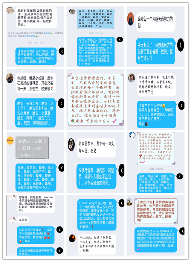 活动前期我院心理部成立了一个“晚安”官Q,通过经济与管理学院官方平台进行宣传。“晚安”官Q于每天晚上10点准时收集大家的晚安语录,并随机发送给每一位参加活动的同学。同学们在与他人道晚安的同时也会收到来自别人的暖心晚安。夜晚是一天忙碌学习生活的结束,也是一天总结的好时机,同学们在这一天经历着很多不同但值得分享的事情。睡觉前在一个安静的环境里,在用心编辑着自己想对他人分享的暖心晚安语录的同时,自己的心情也会在这个过程中得到舒缓和放松,伴随着他人送来的温暖晚安,同学们带着这份甜蜜与美好逐渐进入梦乡。