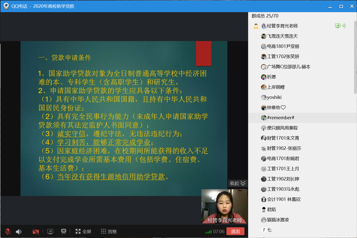 为加强同学们对助学贷款政策的认识,进一步做好诚信教育和资助育人工作,使学生全面了解国家助学贷款政策,促进广大学子顺利完成学业,8月6日,经济与管理学院李育光老师召开线上国家高校助学贷款宣讲会,为学生详细讲解贷款资助政策。