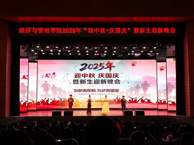 金秋送爽,双节临门。9月29日晚,经济与管理学院2025年“迎中秋·庆国庆”暨新生迎新晚会在东风校区大礼堂隆重举行。学院2025级新生辅导员、朋辈导师们和全体新生齐聚一堂,在璀璨灯光中共庆双节,在青春旋律中开启新篇。