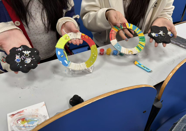 本次活动以星河为意象,设置了星芒重塑、星环编织、星河引力传递、情绪接力赛等四个环节。在“星芒重塑:压力变形记”环节,同学们通过捏塑黑色超轻粘土,将内心压力具象化为“黑暗星云”,再借助闪粉、亮片等材料将其改造为璀璨“希望星芒”,在创作中体验压力外化与转化的心理疗愈;“星环编织:专注力疗愈工坊”环节里,大家以宇宙星环为主题,用毛线在环形木板上缠绕编织,在重复手工动作中感受平静与专注,完成的“心灯守护环”成为安抚焦虑的视觉锚点;“星河引力传递”活动中,5 - 6人一组用悬挂发光星星的长绳连接彼此手腕,通过协调动作保持绳子紧绷,直观感受团队联结与支持,增强默契与归属感;“情绪接力赛”则让同学们分组演绎情绪传递,在夸张表演与观察中敏锐觉察情绪变化,提升共情能力。同学们在创作与互动中释放压力、探索内心。此次活动,不仅帮助同学们学习到了心理调适的方法,更对自我有了更深刻的认知。