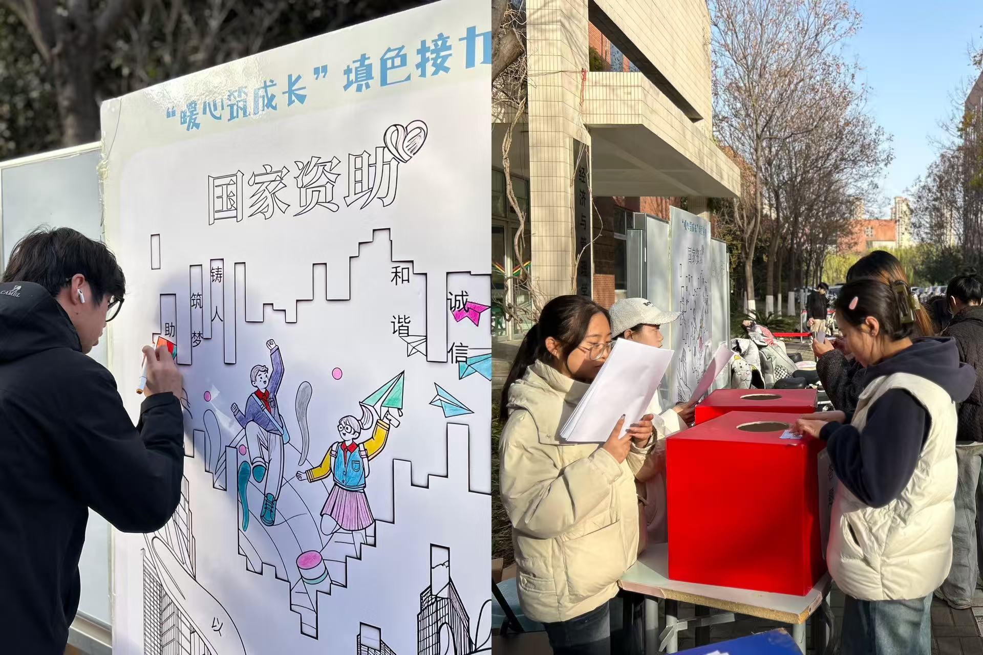 活动(一)以“知识输入+思想引领”为核心,通过趣味互动创新政策宣传模式,既助力学生掌握资助知识,更以思政引领塑造价值认知,实现政策普及与思想铸魂的双重目标。本次活动精心设置特色关卡,将资助知识与互动体验深度融合。在“暖心筑成长”填色接力中,以创意笔触诠释资助内涵,彰显育人意义;“盲盒开卷·助学知礼”环节借互动普及奖贷政策,强化思想认知;“助学育人猜猜乐”组队挑战,凭借趣味形式传励志反哺理念,提升感恩意识。同学们在闯关中共识“资助为基,奋进为向”的成长理念,深化资助育人的思想认同。